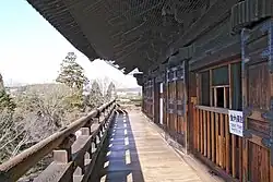 The temple's Sanmon gate was originally constructed in the 13th century, destroyed in 1369 at the order of the government, and reconstructed in 1628.[9] The gate contains stairs to an elevated viewing area, which was the setting for a famous scene in the 1778 Kabuki play Sanmon Gosan no Kiri[10] inspired by the story of the criminal Ishikawa Goemon who is said to have spoken of the beauty of the view (but who was executed prior to the construction of the current gate).[9]