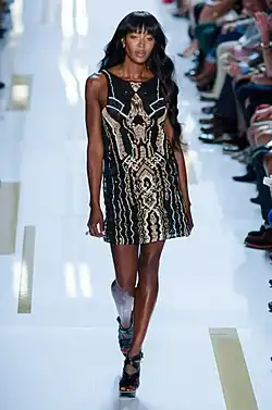As of 2024, Campbell has walked the catwalks and appeared in advertising campaigns for Marc Jacobs, Yves Saint Laurent, Chloé, Diane Von Furstenberg, Prada, Chanel, Givenchy, Dolce & Gabbana, Burberry, Zac Posen, Blumarine, Karl Lagerfeld, Gianfranco Ferré, Versace, Helmut Lang, Christian Dior, John Galliano, Ralph Lauren, Jean Paul Gaultier, Tommy Hilfiger, Oscar de la Renta, Michael Kors, Anna Sui, Louis Vuitton, Hermés, Marchesa, Roberto Cavalli, Valentino, Fendi, Escada, Isaac Mizrahi, La Perla, Philipp Plein, Mango, Thierry Mugler, Balmain, Nars,[72] David Yurman, Alessandro Dell'Acqua, DSquared2, Express, H&M, Bloomingdale's, Dillard's, Neiman Marcus, Gap, Avon, Revlon and Victoria's Secret.