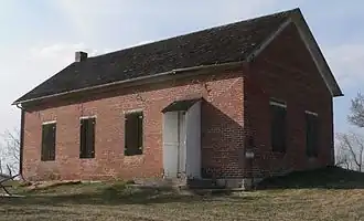 Originally a two-story structure in Rock Bluff, Nebraska, today the one-story brick school is all that remains of a ghost town. Rock Bluff was a popular crossing on the Missouri River, and had a post office, a mayor, the county fair, a common lodge hall for Masons and Odd Fellows, and a variety of businesses including three stores, two blacksmith shops, two saloons and a billiard hall. There was a race track near the steamboat landing, and a coal mine south of town.[1]