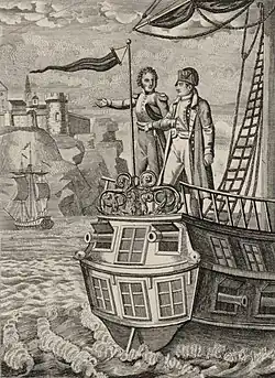 Following his abdication on June 22, 1815, Napoleon proceeded to the Atlantic coast, where the French government, under the leadership of Fouché, had arranged for two frigates to facilitate his departure for America. However, the English squadron's blockade of the La Rochelle and Rochefort region effectively prevented him from leaving.[1] On July 15, 1815, Napoleon surrendered to the British forces near the Île d'Aix and was subsequently transported to Torbay and then Plymouth on England's southwest coast aboard the HMS Bellerophon. He assumed the British government would permit him to reside in the English countryside.[2] Upon learning of his deportation to the island of Saint Helena on July 31, Napoleon was transferred on August 7, 1815, to the Northumberland, which took him on a journey lasting two months and one week.[note 2][3]