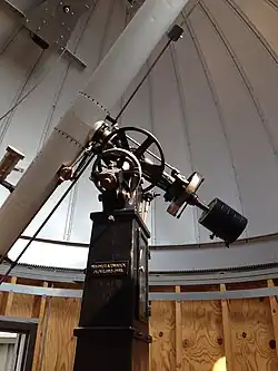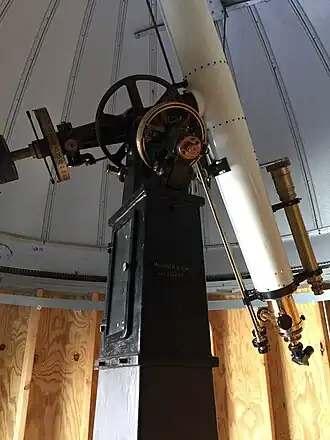 To augment the new observatory, the Napoleon III Telescope was placed on a new mount obtained from the Warner & Swasey Co. of Cleveland, Ohio. The original Foucault lens was also refigured by J.M. Brashear of Pittsburgh, Pennsylvania.[5] Warner & Swasey Company is best known for completing mounts for the Lick Observatory and Yerkes Observatory refracting telescopes which at the time where the largest telescopes in the world.[26] An example of a 6-inch Warner & Swasey telescope mount is depicted in a Few Astronomical Instruments from the Works of Warner & Swasey, Plate II.[27] In 1894 a "modern telescopic chair" was obtained for the observatory. The chair and observatory was meant for student use, and the new chair had been used to observe Saturn.[28]