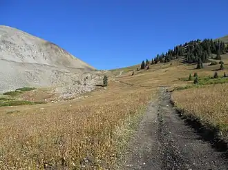 The Napoleon Pass wagon road was built in 1882 to connect the mining towns of Tin Cup to the north and Pitkin to the south. This road, along with the nearby Cumberland Pass road, allowed ore from Tincup-area mines to be shipped to the Quartz Station of the Denver & South Park Railroad. The ore was then shipped by rail east through the Alpine Tunnel.[2][4]