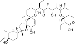 Narasin is a coccidiostat and antibacterial agent.[1][2] It is a derivative of salinomycin with an additional methyl group. Narasin is produced by fermentation of a strain of Streptomyces aureofaciens.[3]
