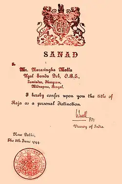 Narasingha was the only son of Chandi Charan Malla Deb, the titular Raja.