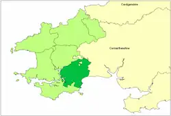 The hundred spanned the linguistic boundary, with the parishes of Velfrey being identified by George Owen[3] as Welsh-speaking, and the southern coastal part being English-speaking, part of Little England beyond Wales. The area in 1887 was 55,813 acres (22,587 ha).[4]