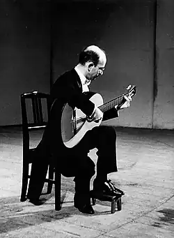 When he was 13, he was accepted to study at the Conservatorio de Valencia with the pianist and composer Vicente Asencio. Here he followed courses in harmony, composition, and performance. Yepes is credited by many with developing the A-M-I technique of playing notes with the ring (Anular), middle (Medio), and index (Indice) fingers of the right hand.[2] Guitar teachers traditionally taught their students to play by alternating the index and middle fingers, or I-M. However, since Yepes studied under teachers who were not guitarists, they pushed him to expand on the traditional technique. According to Yepes, Asencio "was a pianist who loathed the guitar because a guitarist couldn't play scales very fast and very legato, as on a piano or a violin. 'If you can't play like that,' he told me, 'you must take up another instrument.'" Through practice and improvement in his technique, Yepes could match Asencio's piano scales on the guitar. "'So,' he [Asencio] said, 'it's possible on the guitar. Now play that fast in thirds, then in chromatic thirds.'"[3] Allan Kozinn observed that, "Thanks to Mr. Asencio's goading, Mr. Yepes learned "to play music the way I want, not the way the guitar wants."[4] Similarly, the composer, violinist, and pianist George Enescu would also push Yepes to improve his technique, which also allowed him to play with greater speed.[5]