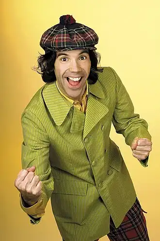 Nardwuar the Human Serviette[3][2] (born John Andrew Vernon Ruskin, July 5, 1968),[4] or simply Nardwuar, is a Canadian celebrity journalist and musician.[5] He formed the Vancouver-based garage rock band the Evaporators in 1986, for which he serves as lead singer and keyboardist.[6] He is best known for his in-depth interviews with musicians, celebrities, and politicians, where his thorough research and extensive knowledge often surprise them—uncovering forgotten details or well-kept secrets they never expected anyone to know.