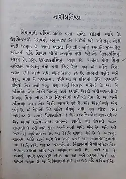 ![]() First page of Nari Pratishtha; from Manilal Na Tran Lakho, edited by Dhirubhai Thaker | |