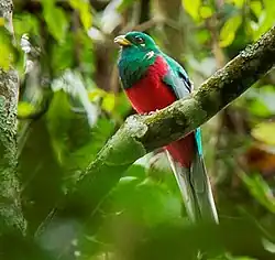 The Narina trogon (Apaloderma narina) is a largely green and red, medium-sized (32–34 cm long), bird of the family Trogonidae. It is native to forests and woodlands of the Afrotropics. Though it is the most widespread and catholic in habitat choice of the three Apaloderma species, their numbers are locally depleted due to deforestation.[2] Some populations are sedentary while others undertake regular movements.