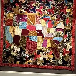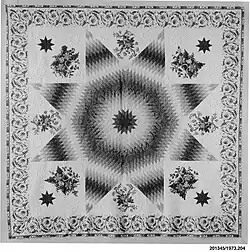 Weaving clothing and blankets was common among many of the American Indian tribes, especially the Navajo. Patterns would be woven into blankets and rugs, oftentimes with some form of significance.[9] However, as more European and American settlers began moving west, efforts were made to "civilize" the Indians. Quilting was thus adopted into the American Indian way of life, initially through school systems and sewing circles. However, quilting quickly became another expression of the culture of the American Indians. One of the most important quilt patterns that was seen throughout the American Indian communities was the Star Quilt. It had both common, utilitarian purposes, as well as ceremonial purposes. They also became very important to the economy of the reservation.[10]