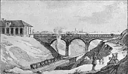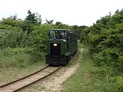 The Voldbanen military railway at Vestvolden, south-west of Copenhagen used 1,000 mm (3 ft 3+3⁄8 in), 785 mm (2 ft 6+29⁄32 in), 750 mm (2 ft 5+1⁄2 in) and standard gauges.[23][24][25][26][27][28] Vestvolden is part of Copenhagen's fortifications and the railway runs from Lyngby (Kongens Lyngby) to Køge and connected to the Frederikssund railway. A gunpowder factory in Frederiksværk supplied gunpowder for this military facility and for other military facilities in Denmark.[29][30]