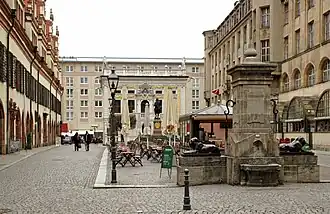 Since the second half of the 16th century, the east side of the square had been built up with several buildings of municipal institutions on the site of the former Burgkeller (burgess cellar) block:[5] the cookshop (1565), the shoe and fur shop (1572) and the bread and meat counters (1578).[3] There was also a tower with some detention cells. This and the northern part gave way to the Stockhaus, an inner-city prison, at the beginning of the 19th century, and in 1830 the guard room of the Leipzig municipal guard moved into the neighboring building, along with the police and tax authorities. In 1903, the memorial to Goethe was created by Carl Seffner (1861–1932) in front of the stock exchange, commemorating Goethe's time from 1765 to 1768 as a student in Leipzig.[4] In 1908/1909 the entire east side was replaced by the new Handelshof trade fair building.