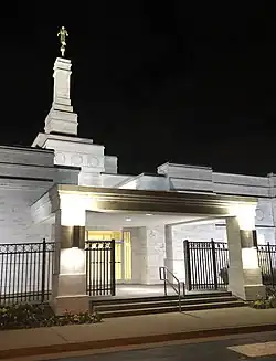 The Nashville Tennessee Temple is the 84th operating temple of the Church of Jesus Christ of Latter-day Saints,[2] and is located in Franklin, Tennessee, United States, approximately 20 miles (32 km) southwest of central Nashville. The intent to build the temple, the first in Tennessee, was announced August 7, 1994, by church president Gordon B. Hinckley.[3] The temple has a single spire with a statue of the angel Moroni at its top, and is built from Imperial Danby white marble, using a simplified, contemporary temple design. The temple is on a 4.98-acre site adjacent to an existing meetinghouse.