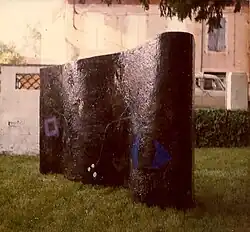 The imposing sculpture Evolution/The Wall, 1974,[2] a solitary, undulating wall section, appears as an abstract black void, decorated with organic white lines and colored shapes ranging from rudimentary squares to recognizable human eyes. In the artist's own words: “By the design and undulation on this sculpture, I have tried to show man in constant movement through the centuries, tying with a white line his most primitive expression (the square) to that of his intelligence, his intellectualism (the eye), by means of a white line, the whole calculated to vaguely resemble a face.”[1]