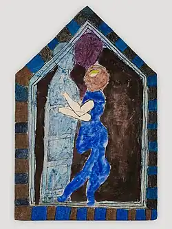 The later "Icons" series comprises 18 works, inspired by the icons and ex-votos that abound in Greek Orthodox churches. They are painted in acrylic on styrofoam board covered with papier-mâché. Highly colored and textured, they depict dreamlike scenes of barely sketched human silhouettes, cities and situations. In Meeting (opposite), for example, a royal-blue figure embraces a statue; a purple bubble above their heads resembles a comic-book speech bubble; all are set against a dark background in a temple-like frame.