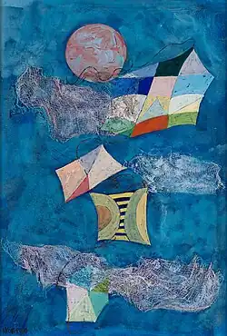 Begun in 1979, the Kites series comprises 39 works, both paintings and assemblages. Soaring through the sky, kites embody childlike joy and a wandering spirit. Here these modest playthings become the locus of a novel geometrical investigation. Riding a gust of wind, they ascend ever further and higher.