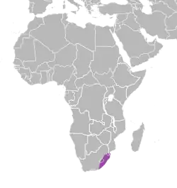 The Natal red rock hare is endemic to southern Africa;[5] it is present in southeastern provinces of South Africa (Eastern Cape, Mpumalanga, and KwaZulu-Natal), eastern Lesotho, Eswatini (Highveld and Lumbobo), and southern Mozambique (Maputo Province).[1] It lives in steep, rocky terrain like cliffs, hillsides with scattered rocks and boulders, stone outcrops, and rocky gorges with edible grass. It takes refuge in tussock grasses or low, dense vegetation. It is found at heights of up to 1,550 metres (5,090 ft) above sea level.[1][6]