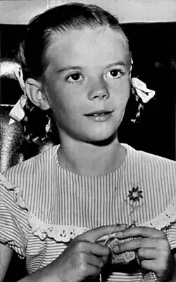 Film historian John C. Tibbetts wrote that for the next few years following her success in Miracle, Wood played roles as a daughter in a series of family films: Driftwood (1947), at Republic;[37] Scudda Hoo! Scudda Hay! (1948); Chicken Every Sunday (1949); The Green Promise (1949); Fred MacMurray's daughter in Father Was a Fullback (1949), with O'Hara; Margaret Sullavan's daughter in No Sad Songs for Me (1950); the youngest sister in Our Very Own (1950); Never a Dull Moment (1950); James Stewart's daughter in The Jackpot (1950); Dear Brat (1951); Joan Blondell's neglected daughter in The Blue Veil (1951); The Rose Bowl Story (1952); Just for You (1952); and as the daughter of Bette Davis' character in The Star (1952).[3] In all, Wood appeared in over twenty films as a child. She also appeared on television in episodes of Kraft Theatre and Chevron Theatre.
