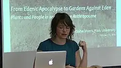Natasha Myers is an associate professor of anthropology at York University.[1] In 2016 she coined the term "Planthroposcene".[2][3] Her first book, Rendering Life Molecular: Models, Modelers, and Excitable Matter is an ethnography of protein crystallographers and discusses how scientists teach one another how to sense the molecular realm.[4] This book won the 2016 Robert Merton Book Prize from the Science, Knowledge, and Technology Section of the American Sociological Association.[5] She received her BSc in biology from McGill University, a Masters in Environmental Studies from York University's Faculty of Environmental Studies and her PhD in the Program in History, Anthropology, and Science, Technology & Society (HASTS) at the Massachusetts Institute of Technology.[6]