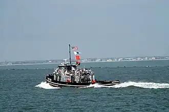 ![]() Natchitoches (YTB-799) heads across Charleston harbor with reporters and cameramen aboard.