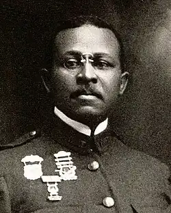 Wherever he moved, Smith would organize a variety of different bands and choirs. These included beginner bands, youth touring bands, choral societies, and even symphony orchestras. He began organizing bands in Wichita where one of the bands was selected to attend the 1893 Chicago World's Fair. While in Chicago with the band Smith signed an agreement with Lyon & Healy to work in their music publications division by organizing a number of bands and choruses.[2] For this job, he moved to Chicago where he started a number of bands. In addition, he led the band for the Eighth Illinois Infantry unit for four years. During this time, he went with the infantry unit to the front lines in the Spanish–American War where he met Theodore "Teddy" Roosevelt at the Battle of San Juan Hill.[2][5] His military rank and promotion during this period are not precisely clear,[3] however, it is generally contended that during this period he achieved the rank of Major in the United States Army.[4] While living in Chicago he studied at the Chicago Musical College, where he had to register as a "private student" to attend classes at the otherwise all white school.[1][4] It was during this time in Chicago that his daughter Anna was born.[3]