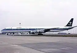 In December 1981, the CAB certificated United Air Carriers (UAC2) (a different entity from UAC1, which dissolved into ONA1) as a charter carrier with authority for passenger and freight both domestic and international. ONA1 owned 100% of UAC2, but UAC2 also did business as "Overseas National Airways". Hence "Overseas National Airways" (ONA1) was both the owner of UAC2, but also its tradename (ONA2).[7] ONA1 (and its predecessor) had been consistently profitable since 1977, with nine-month's revenue to March 1981 of $35.6 million (over $120 million in 2025 terms) and pre-tax profits of $3.5 million,[8] and controlled over 30 large commercial aircraft, including 15 Douglas DC-8s and a Boeing 707.[9] The certificate was effective (including FAA operational authority) in February 1982.[10] The company's headquarters were at John F. Kennedy International Airport in New York.[11] 1982 was the first year "United Air Carriers" or "Overseas National Airways" appears as an airline in the annual FAA Statistical Handbook of Aviation.[12] Neither is present in that publication in 1979,[13] 1980[14] or 1981.[15] As of January 1983, UAC2 had pilot bases at New York and Jeddah.[16]