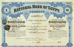 During the 25th of June [4] 1898, Sir Ernest Cassel (50% ownership), the three brothers Joseph Suares (1837–1900), Raphael Suares (1846–1909) and Felix Isaac Suares (1844–1906),[5] Moise Cattaui (25%) and Constantine Salvagos of Alexandria (25%) established the National Bank of Egypt (NBE), though Cassel remained in England. NBE established an agency in London.