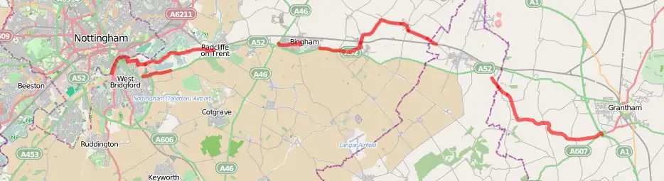 Between Gamston and Radcliffe-on-Trent the route remains signed along its former alignment on the shared use paths adjacent to the A52.