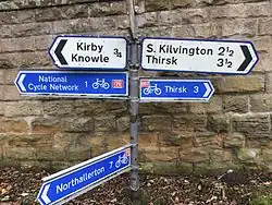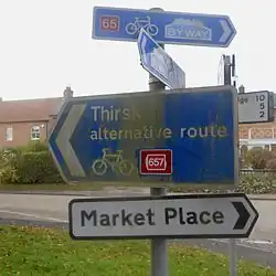 The route was created as part of the White Rose cycle route.[1] It was signed as a branch of Route 65. The White Roses cycle route is no longer promoted and the signs have been updated by the addition of route 657 stickers.