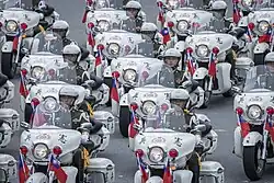The mobile column, for many years, served as a crowd favorite of National Day civil-military parades, since in this segment the ROC shows off to its people the advanced and modern military equipment and vehicles in service and those being introduced, many of them nationally produced, for use by the servicemen and women of the ROCAF, and since 2016, the state civil security institutions. As in every parade, the ROCMP's motorcycle column leads off the mobile column segment, followed by (as of 2016):