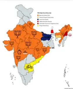 The National Democratic Alliance (NDA; ISO: Rāṣṭrīya Lokatāntrik Gaṭhabandhan) is an Indian big tent multi-party political alliance, led by the country's biggest political party, the Bharatiya Janata Party (BJP).[7] It was founded on 15 May 1998.[8] It currently has a majority in both the Lok Sabha and the Rajya Sabha, and controls the Government of India as well as the governments of 19 out of 28 Indian states and 2 out of 3 Union territories with legislative assemblies.