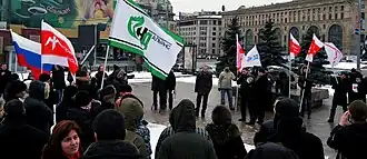 The movement regularly makes political statements in defence of a free economy,[3] political freedoms,[4] reform of the MVD[5] The NDA officially established friendly relations with the Latvian party Visu Latvijai!