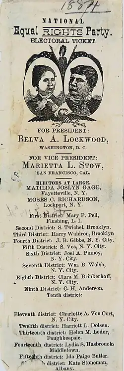 The National Equal Rights Party (NERP) was a United States minor party during the late 19th century that supported women's rights.[3] The party was notable for nominating two female presidential candidates: Victoria Woodhull in 1872 and Belva Lockwood in 1884 and 1888.[3] Woodhull and Lockwood are generally considered the first women who ran for president in the U.S. Although women could not vote in federal elections at the time, there were no laws prohibiting women from running for president.[4] In the 1876 and 1880 presidential elections, the party supported Peter Cooper (Greenback Party) and James Weaver (Greenback-Labor Party).[5] Their platform focused on equal rights for men and women.[6]