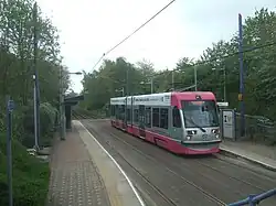 The original fleet consisted of 16 AnsaldoBreda T-69 trams. These were replaced by 21 CAF Urbos 3s in 2014/15.[8] Originally trams were intended to carry an off-white with yellow, blue and green stripes livery,[9] but instead carried a purple, yellow, red, green and grey livery. This was replaced by a pink and silver livery in 2007.[10]