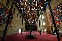 In 1959, the commission to design a new gallery was awarded to the architectural firm Grounds Romberg Boyd. In 1962, Roy Grounds split from his partners Frederick Romberg and Robin Boyd, retained the commission, and designed the gallery at 180 St Kilda Road (now known as NGV International). The new bluestone clad building was completed in December 1967[14] and Victorian premier Henry Bolte officially opened it on 20 August 1968.[15] One of the features of the building is the Leonard French stained glass ceiling, one of the world's largest pieces of suspended stained glass, which casts colourful light on the floor below.[16] The water-wall entrance is another well-known feature of the building.