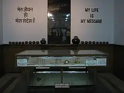 The National Gandhi Museum Gallery has a large number of paintings and personal items of Mahatma Gandhi. The most notable items in the collection are a Satyagraha woodcut by Willemia Muller Ogterop, one of Gandhi's walking sticks, the shawl and dhoti worn by Gandhi when he was assassinated, one of the bullets that were used to kill Gandhi and his urn.[5] The Museum also displays some of Gandhi's teeth and his ivory toothpick.[6] Galleries of the museum are martyrdom gallery, commemorative gallery, art gallery where arts made on Gandhi is open for viewing. Museum also includes a general photo gallery.