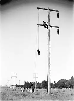The first transmission line constructed by the government was associated with the Okere Falls Power Station near Rotorua. Electricity was transmitted at 3.3 kV over a 13-mile (21 km) route to Rotorua, and was used to drive sewage pumps, and some public buildings including five thermal baths.[6]