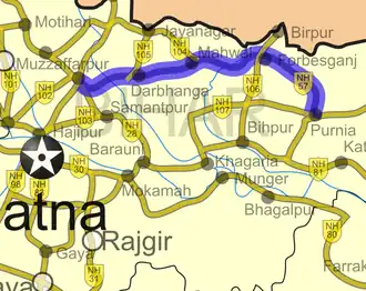 This former national highway passed through Muzaffarpur, Darbhanga, Muria, Supaul, Narahia, Narpatganj, Forbesganj, Araria, Jhanjharpur and Purnia.