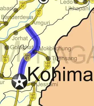 National Highway 61 (NH 61) is a National Highway of India. It runs from Kohima, the capital of the state of Nagaland and ends at Jhanji in the state of Assam. The highway is 240 km (150 mi) long, of which 220 km (140 mi) is in Nagaland and 20 km (12 mi) is in Assam. [1] In 2010, the highway was renumbered to form part of present-day NH 2.