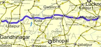 | Primary destinations | Pindwara - Udaipur - Chittaurgarh - Kota - Shivpuri - KARERA - Jhansi - Banda - Allahabad | |||
