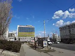 In 2021, the National Hotel's new owner Vladimir Andronachi asked the local government for permission to demolish the building and replace it with office space.[2] This request was temporarily granted, but the decision was reversed amid government infighting and external public pressure.[2][6][7] In 2022, the court overseeing a legal case against Andronachi for alleged money laundering ordered that the hotel be held as potential compensation should Andronachi lose.[8][9] During the same year, graffiti artists painted a large Ukrainian flag on the building in protest of Russia's invasion of that country.[2] Other artists subsequently overpainted parts of that flag with symbols related to Russia and its invasion, including orange and black lines and Russian military symbols.[10] In June 2024, it was repainted with the Moldovan flag.[2]