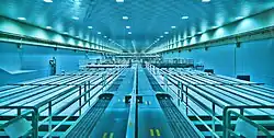To ensure that the output of the beamlines is uniform, the laser is amplified from a single source in the Injection Laser System (ILS). This starts with a low-power flash of 1053-nanometer (nm) infrared light generated in an ytterbium-doped optical fiber laser termed Master Oscillator.[35] Its light is split and directed into 48 Preamplifier Modules (PAMs). Each PAM conducts a two-stage amplification process via xenon flash lamps. The first stage is a regenerative amplifier in which the pulse circulates 30 to 60 times, increasing its energy from nanojoules to tens of millijoules. The second stage sends the light four times through a circuit containing a neodymium glass amplifier similar to (but much smaller than) the ones used in the main beamlines, boosting the millijoules to about 6 joules. According to LLNL, designing the PAMs was one of the major challenges. Subsequent improvements allowed them to surpass their initial design goals.[36]