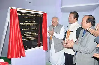 The institute was established in 2010, with bachelor's programs in Computer Science & Engineering, Electronics & Communication Engineering and Electrical & Electronics Engineering. Classes began in 2010 at the Visvesvaraya National Institute of Technology, Nagpur and shifted to Aizawl in 2011.[1] Classes operate from Dawrkawn, Chaltlang locality of Aizawl. The foundation stone of the NIT Mizoram Lengpui Campus was laid by Kapil Sibal, Minister of Human Resource Development on 13 October 2012.[2] The Department of Mechanical Engineering and Civil Engineering programs followed in 2013.