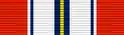 The cross is suspended from a ribbon 1.375 inches (34.9 mm) wide. It consists of wide edge stripes of scarlet, a stripe of white separated by a thin stripe of old glory blue, with central stripe of golden yellow bordered on each side by stripes of old glory blue.[3]