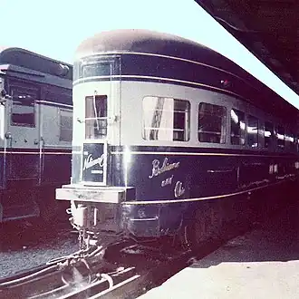 ![]() The Baltimore and Ohio Railroad's National Limited observation car with drumhead at Union Station (Washington, D.C.), in 1961. The car is one of three acquired from the New York Central Railroad in 1956. | |||||