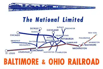 The National Limited was the premier train of the Baltimore and Ohio Railroad (B&O) on its route between Jersey City, New Jersey, and St. Louis, Missouri, with major station stops in Washington, D.C., and Cincinnati, Ohio. (Buses took passengers from New York City to Hudson River ferries; the travelers would transfer onto trains in Communipaw Terminal in Jersey City.) It operated from 1925 to 1971. For much of its life it offered exclusive all-Pullman service, and it was the first long-distance train to be entirely air-conditioned. The National Limited was one of many trains discontinued when Amtrak began operations on May 1, 1971. Amtrak revived the name for another New York–St. Louis service which did not use the B&O route.