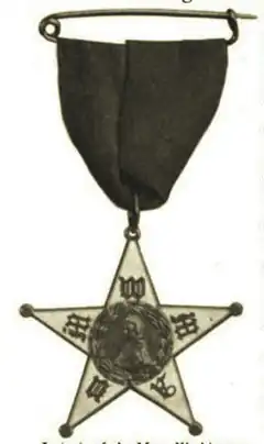 The payment of US$25 by one person at the same time entitled the person so paying to a Hereditary Life Membership in the Association, the certificate of which was a silver medal in the form of a star with the head of Mary, the mother of Washington, in the center, the initials of the Association (N.M.W.M.A.) in blue and white enamel upon the five points on the obverse side, and the Washington Heraldic colors on the reverse side. Those giving US$35 received a gold medal.[9] This Association being organized for perpetuity, these Life Members, and their successors by inheritance, were privileged to aid in caring for the protection and preservation of the grave and monument of the mother of Washington for all future time. These medals are as an inheritance to descend from mother to daughter or granddaughter, and so on in the direct female line, or failing these, by will or deed, and entitle the inheritor to a vote at all meetings of the Association.[4]