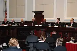 In the years since, the moot court competition has expanded to include competitions in 15 regions throughout the continental United States.[3] The cases argued traditionally focus on a timely issue arising under the United States Constitution, in keeping with the competition's original theme of appellate advocacy. The final national competition continues to be held in New York, and the final argument between the top two teams is judged by a seven-person mock court, including prominent jurists, the president of the New York City Bar Association and the president of the American College of Trial Lawyers.