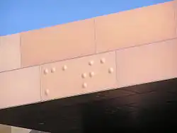 The exterior of the building is covered in anodised aluminium panels. Many of the panels include words written in braille and other decorative devices. Among the messages are "mate" and "she'll be right". Also included were such controversial words and phrases as "sorry" and "forgive us our genocide". These more controversial messages have been obscured with silver discs being attached to the surface making the braille illegible.[13]