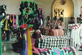 One of the museum's most famous exhibits—originally the work of Tzigara-Samurcaș—is "the house in the house". The house, which originally belonged to peasant Antonie Mogos of Ceauru village in Gorj County. From the first, the house was displayed in a non-naturalistic way: objects that would normally be in the interior were displayed in various manners outside; outbuildings were suggested by fragments. The Communist regime displayed the house much more conventionally, outdoors at the Village Museum; it returned to the Museum of the Romanian Peasant in 2002. The current display at the museum revives the original non-naturalistic approach. For example, from a platform, museum visitors may peer into the attic, part of whose wall is stripped away; various objects are arranged inside.[6]